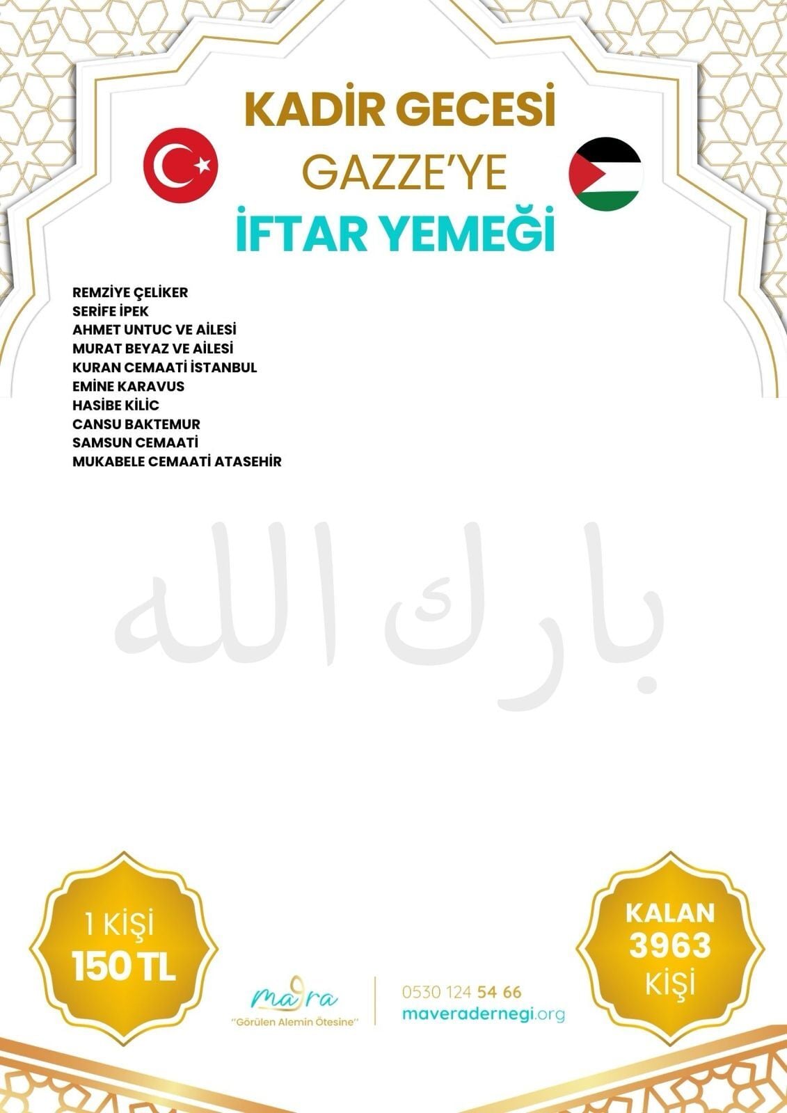 Mavera Derneği, “Gazze Acil Yardım” çalışmaları ile Gazze’de yaşanan insanlık dışı faciaya merhem olmaya gayret ediyor. Bölgede yaşanan sorunlar ciddi derecede büyüdü ve Filistinli kardeşlerimizin ihtiyaçları her geçen dakika artıyor. İsrail’in zulmüne karşı bir şeyler yapmak her Müslüman’ın görevi.